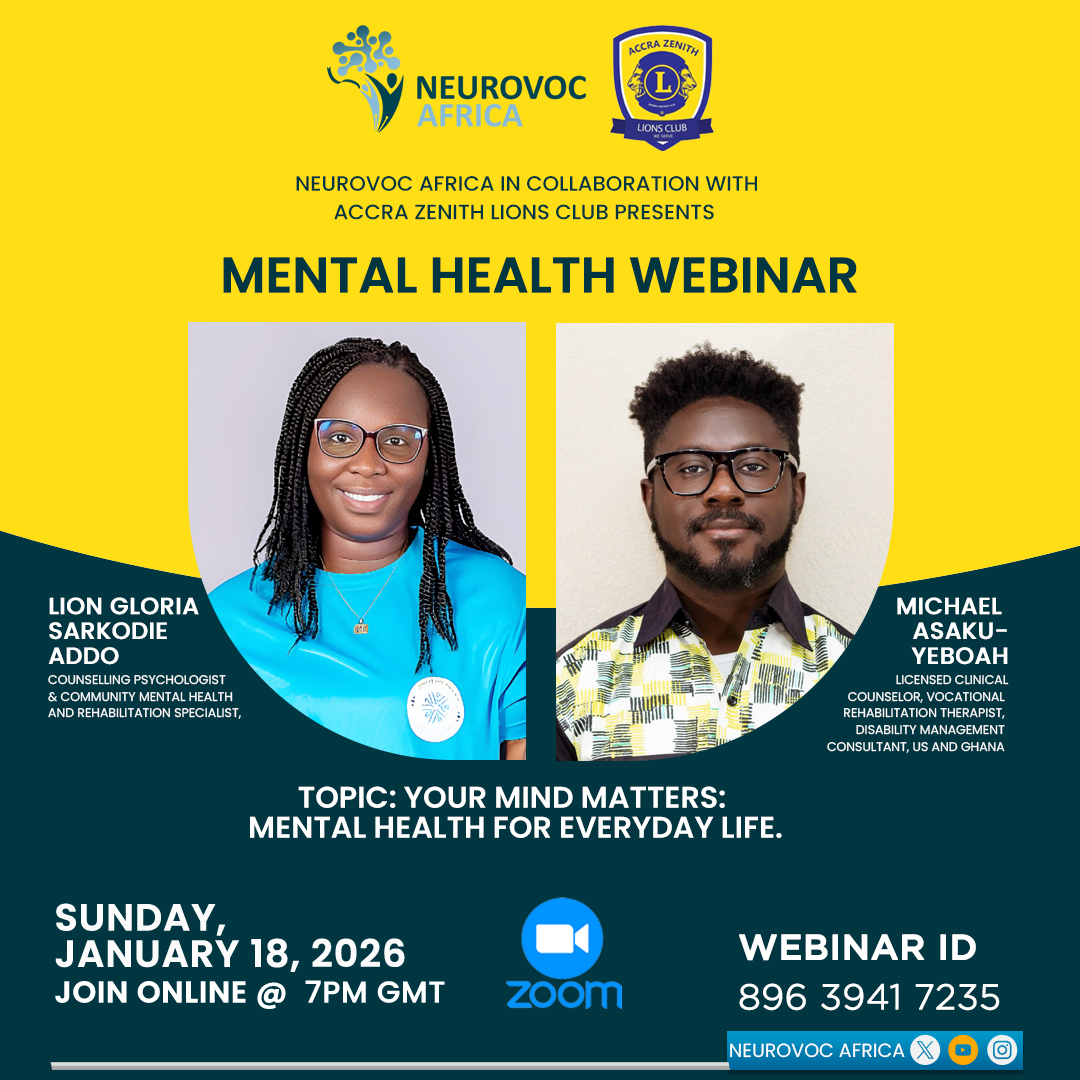 Neurovoc Africa, in collaboration with the Accra Zenith Lions Club, is pleased to present a special Mental Health Webinar aimed at promoting awareness, understanding, and practical strategies for maintaining good mental well-being in everyday life.